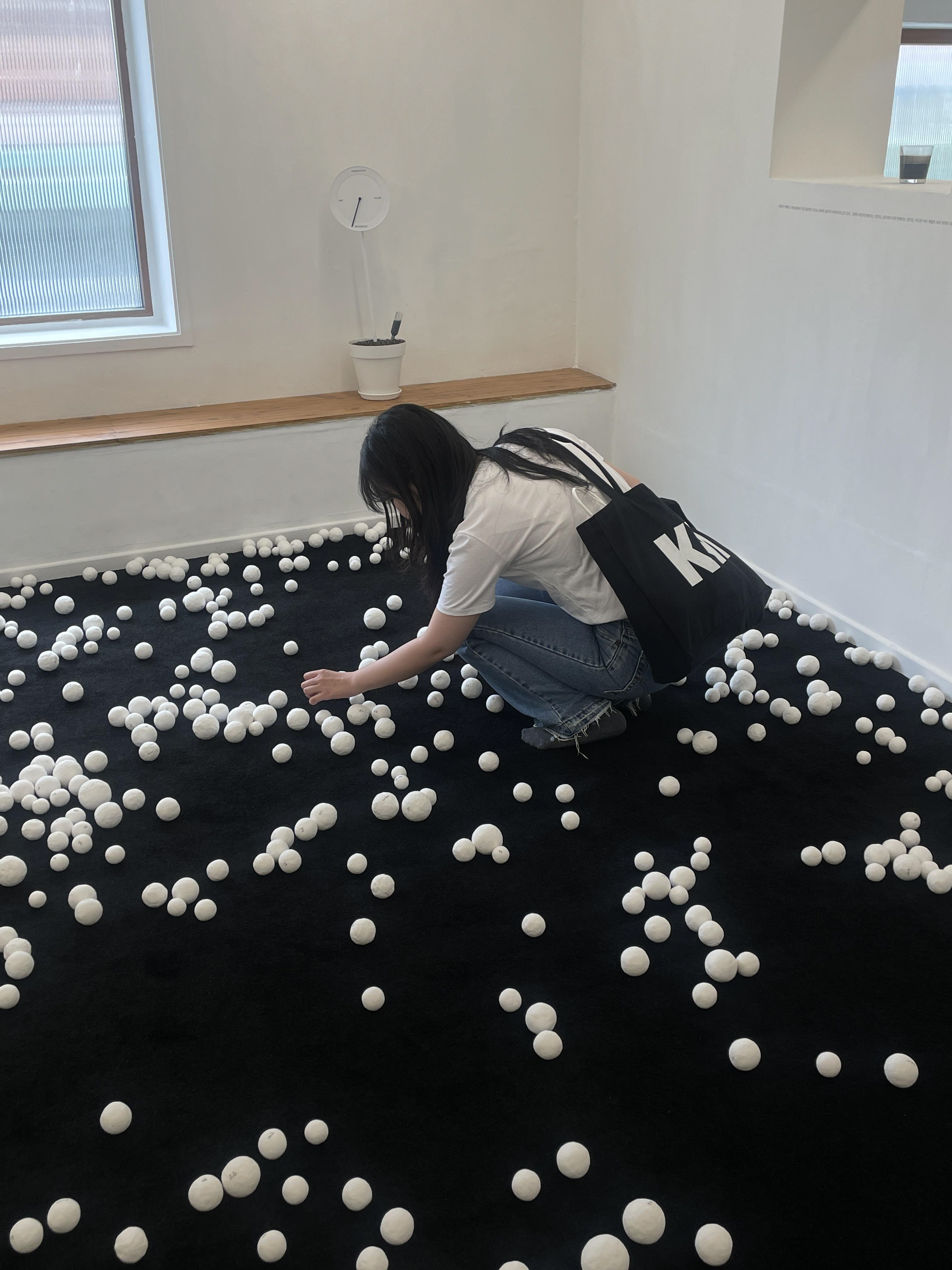 <Emotional Remnants> is an installation art piece that invites viewers to become part of the artwork and interact with it. The countless white spheres symbolize the trivial thoughts and unfinished emotional remnants residing in the artist’s mind, with words related to various emotions and actions of daily life inscribed on each sphere. Viewers are encouraged to freely move these spheres and create new combinations of words, causing the emotional remnants within the artwork to constantly change and shift in the space. Over time, the white spheres repeatedly move, becoming grey, which conveys the idea that thoughts and emotions evolve and leave traces as time passes.
