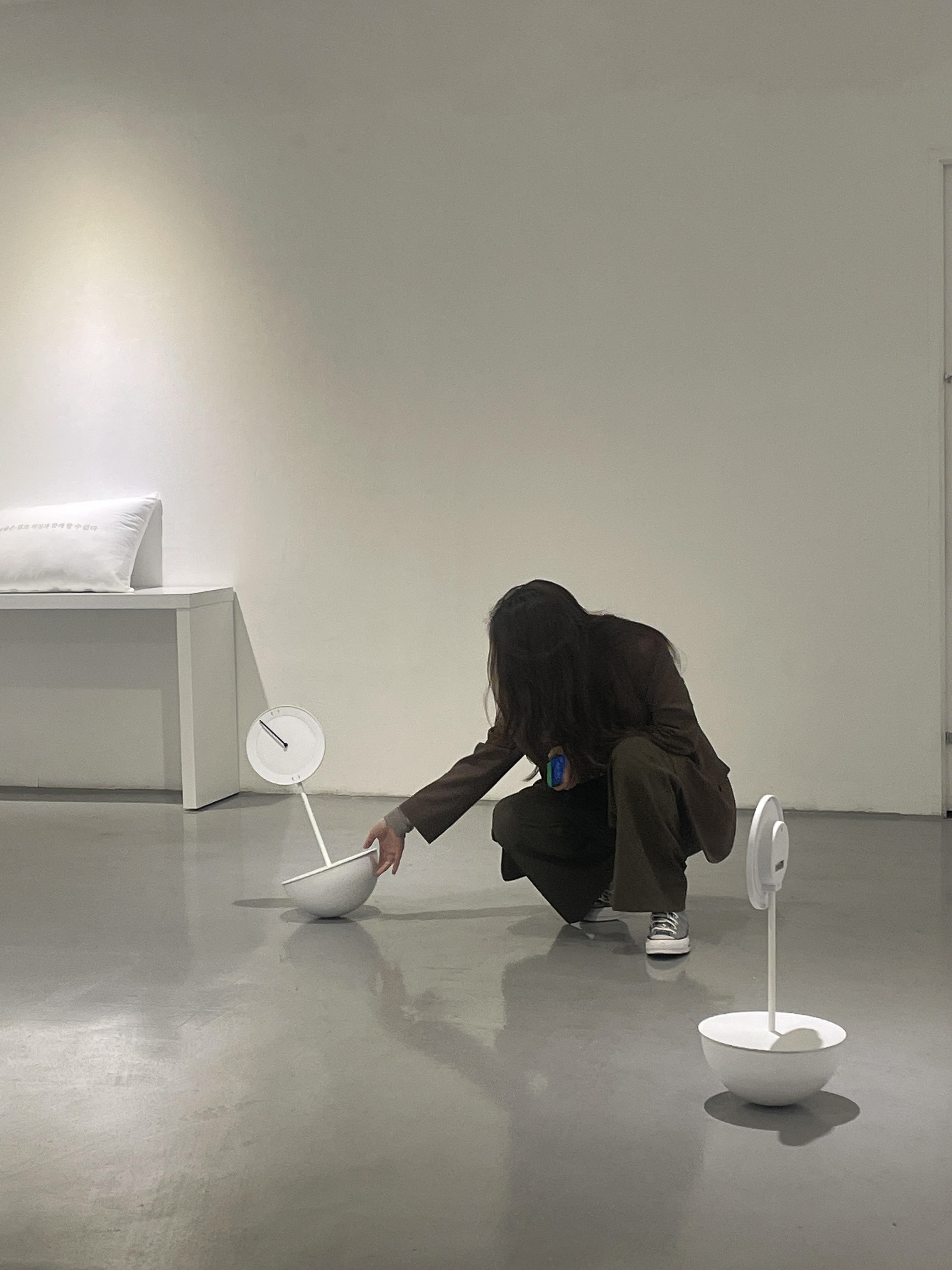 오뚜기는 흔들림 속에서도 다시 균형을 되찾는 상징적인 존재이며, 시계는 시간의 흐름을 나타내고 속에서 끊임없이 움직이는 사건들과 감정들을 상징함과 동시에 우리 삶을 대표한다. 이 작품은 우리의 삶 속에서 일어나는 여러 움직임과 사건들을 통해 경험하고 느끼는 것들이 양가적인 감정과 의미를 담고 있음을 표현하고 있다. 우리의 삶은 완벽하게 균형 잡히지 않을지라도, 그 안에는 요동치는 움직임과 그결과로 인해 다시 찾게 되는 잔잔한 균형과 평화가 존재한다. 우리는 이러한 움직임 속에서 크고 작은 흔들림을 경험하며, 그 속에서 각자의 균형을 잡아나가게 된다. 이 작품을 만져보는 관람객들에게 나는 삶 속의 여러 불안정 속에서도 자신의 균형과 평화를 찾으려는 노력의 가치와 희망을 상기시키고, 불확실한 상황에서도 마음을 놓고 살아가길 바라는 마음을 전달하고자 했다.